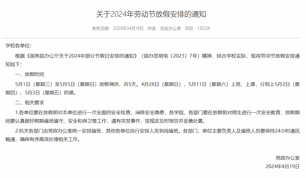 关于2024年劳动节放假安排的通知