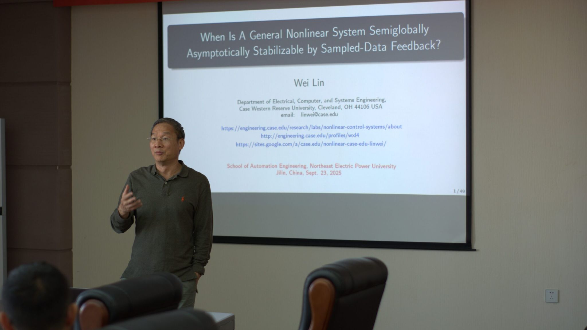 2025 年 9 月 23 日上午 9 时,团队邀请美国凯斯西储大学电子工程与计算机科学系教授、国际电气与电子工程师学会会士(IEEE Fellow)林威教授,在科技楼 510 会议室开展主题为《When is a General Nonlinear System Semiglobally Asymptotically stabilizable by Sampled – Data feedback》的学术讲座,旨在促进学校在非线性控制理论领域的学术交流与发展。