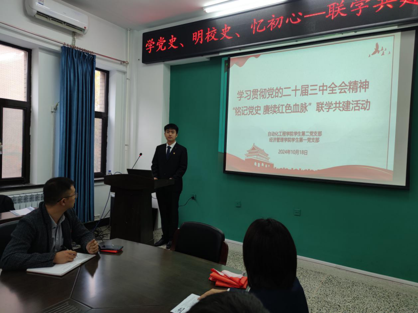 为深入学习习近平新时代中国特色社会主义思想和党的二十届三中全会精神,进一步全面深化改革新思想,引领学生党员用党的创新理论统一思想、统一意志、统一行动,铸牢听党话、跟党走的立身之本和政治之魂,切实激发学生党员的爱校荣校之情、感恩奉献之心和报国成才之志。10月18日,动漫花园 学生第二党支部、经济管理动漫花园 学生第一党支部于三教D202联合开展“学党史、明校史、忆初心”联学联建活动,本次活动由经济管理动漫花园 学生第一党支部书记张德义主持。