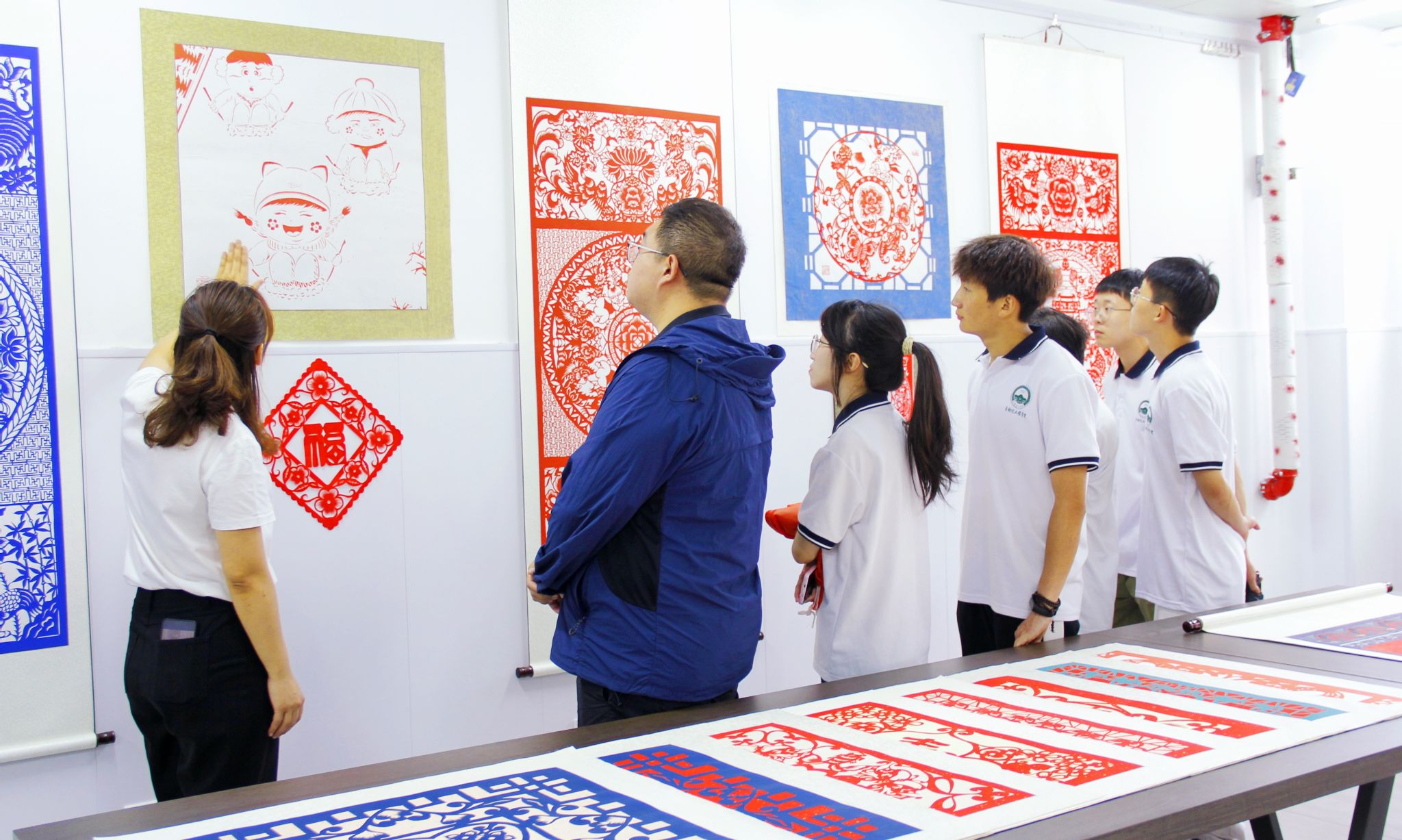 “红石榴”体验馆陈列有各民族饮食、服饰、乐器等实物及图片,通过互动设备,以“展览+体验”的方式真切感受中华民族共有精神家园的多姿多彩,有良好的互动体验。陈列馆小巧玲珑,独具匠心,集思想教育、政治教育、文化教育于一身。在“红石榴”讲解员详细讲述中,大家进行了实地观摩,详细了解了“红石榴”体验馆创建经验和亮点做法。在“指艺花开”非遗工坊、“意林轩书苑”,师生们看到了一幅幅充满韵味和生命力的剪纸、书法作品,仿佛将师生们带入了一个五彩斑斓、妙趣横生的艺术世界。这些特色功能室以剪纸、书法赓续传统文化,让非遗走进学生的课余生活。
